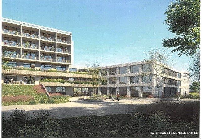 Comme le montre l’image de synthèse, l’extension à l’est du bâtiment actuel prend la forme d’une aile d’une longueur d’une cinquantaine de mètres avec une entrée de l’institution repositionnée au centre du complexe permettant une séparation claire entre l’hébergement long et court séjour.